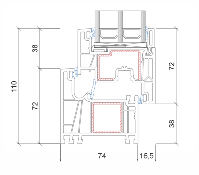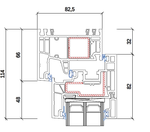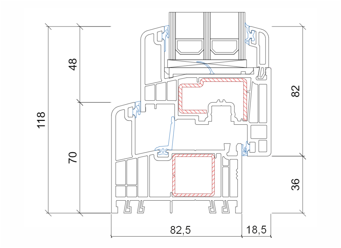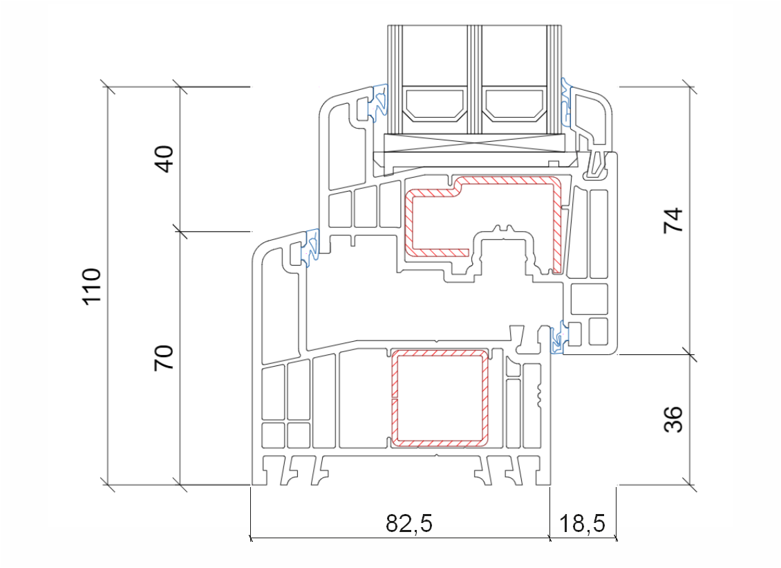 • 6-komorowy system profili o szerokości zabudowy 82,5 mm.