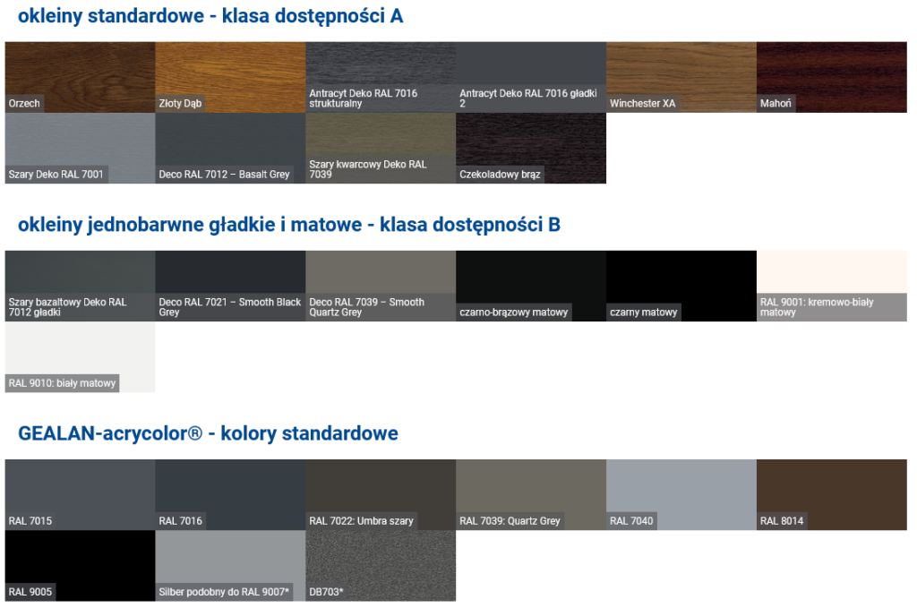• System profili dostępny w różnych kolorach oklein, w tym także w wariantach drewnopodobnych.
