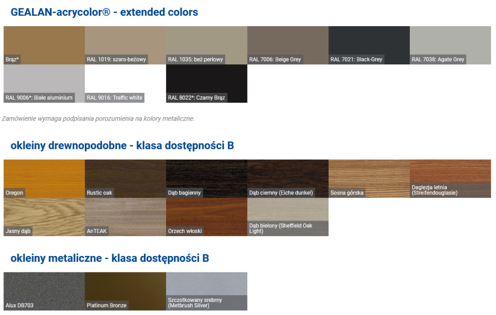 Różnorodność wykończeń: Oferujemy szeroką gamę kolorów i wykończeń, w tym tradycyjne białe okna, okleiny drewnopodobne oraz nowoczesną technologię GEALAN-acrylcolor®, zapewniającą trwałość koloru i odporność na zarysowania.